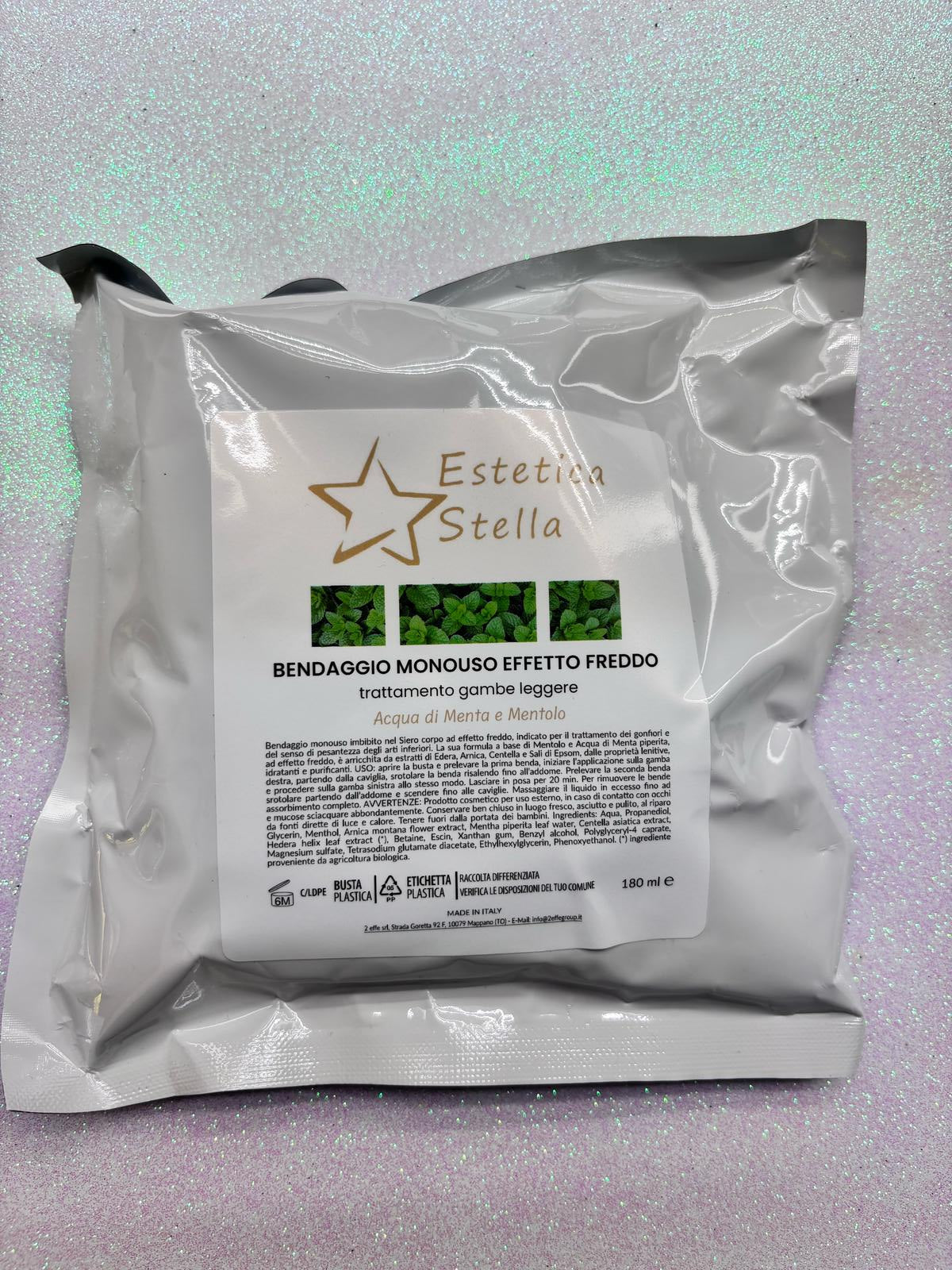 Bendaggio monouso imbibito nel Siero corpo ad effetto freddo, indicato per il trattamento dei gonfiori e del senso di pesantezza degli arti inferiori. La sua formula a base di Mentolo e Acqua di Menta piperita, ad effetto freddo, è arricchita da estratti di Edera, Arnica, Centella e Sali di Epsom, dalle proprietà lenitive, idratanti e purificanti. USO: aprire la busta e prelevare la prima benda, iniziare l'applicazione sulla gamba destra, partendo dalla caviglia, srotolare la benda risalendo fino all'addome. Prelevare la seconda benda e procedere sulla gamba sinistra allo stesso modo srotolare partendo dall'addome e scendere fino alle caviglie.