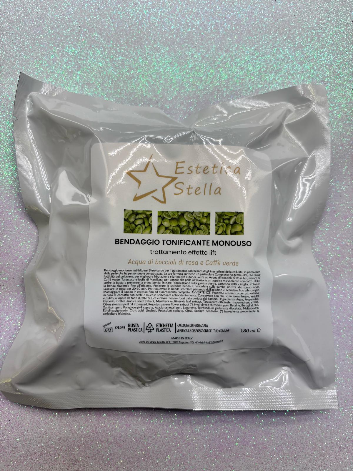 Bendaggio monouso imbibito nel Siero corpo per il trattamento tonificante degli inestetismi della cellulite, in particolare della pelle che ha perso tono e compattezza. La sua formula contiene un particolare Complesso Vegetale-like, che mira