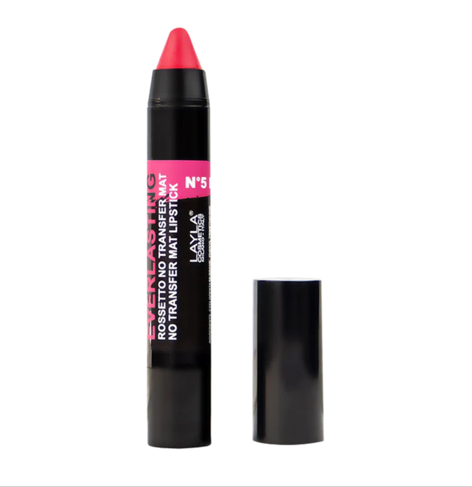 I rossetti Everlasting No Transfer Mat di LAYLA garantiscono un finish sofisticato ed intensamente opaco, con un'eccellente adesione alle labbra, una rapida asciugatura e fissatura, ed una tenuta di almeno 8 ore.